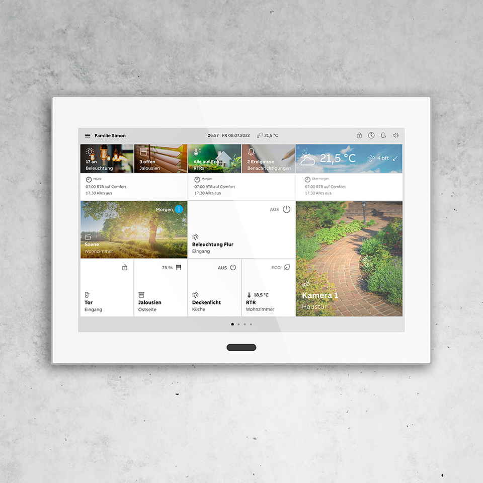 Busch-SmartTouch® 10” setzt als leistungsstarkes Panel neue Maßstäbe in jeder Hinsicht – für Busch-free@home®, Busch-Welcome® und Busch-Installationsbus® KNX. In Kombination mit schwarzem oder weißem Glas sorgen die vier attraktiven Rahmenfarben in jedem Raum für das passende Ambiente. Eine vielseitige Bedienung, ein integriertes IP Gateway und ein Raumtemperaturregler bieten darüber hinaus umfassende Möglichkeiten.